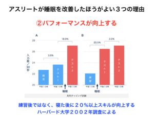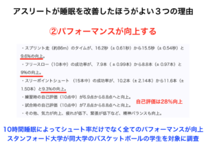 実際に下記の様なデータでも出ており、今後ますますパフォーマンス向上のために睡眠の